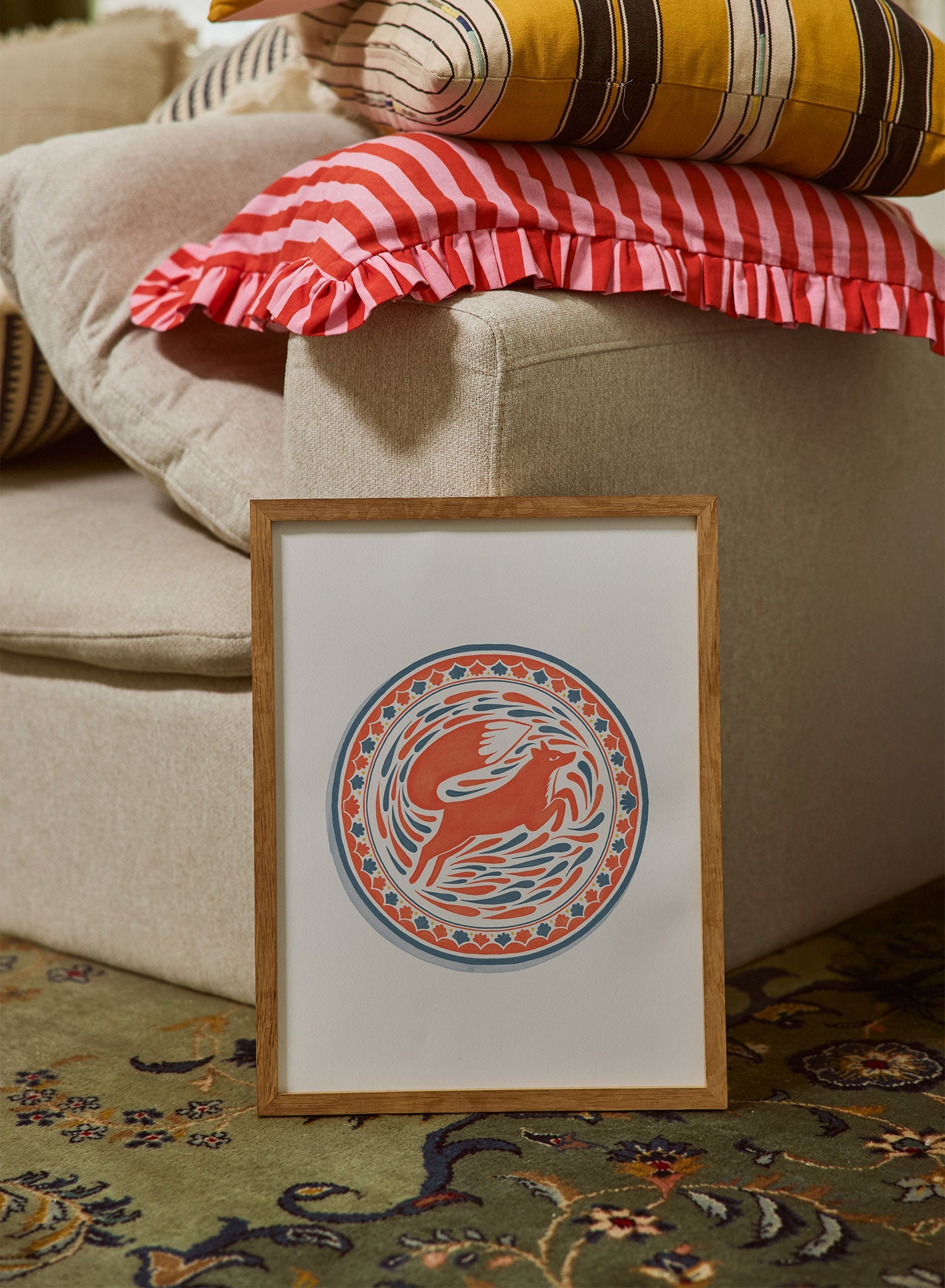 This print features a vibrant circular motif, centered around a stylized bird in bold red, surrounded by intricate floral patterns in shades of blue, yellow, and green. The design is reminiscent of traditional folk art, with its symmetrical arrangement and playful details, set against a soft cream background that enhances its vivid colors.