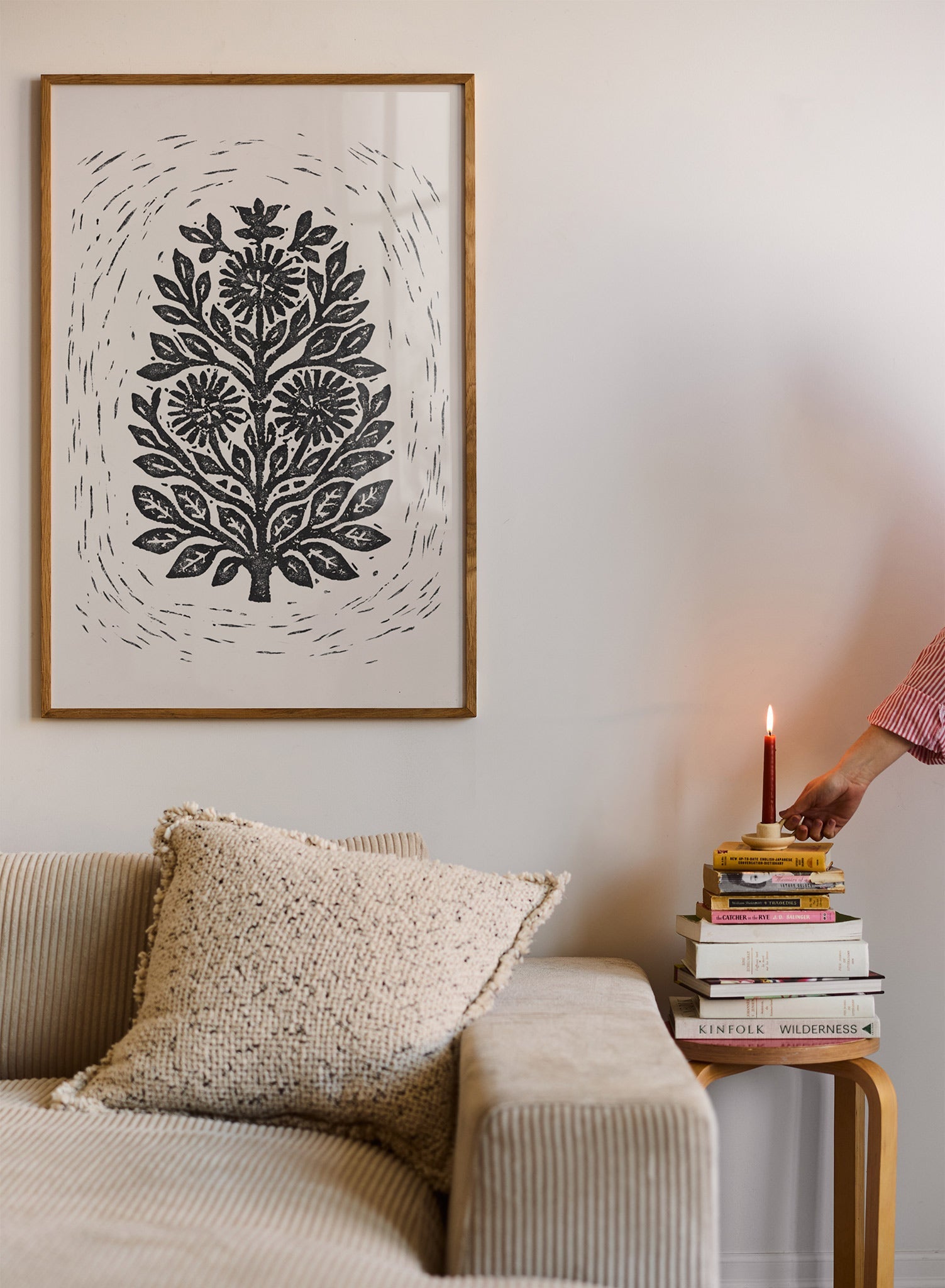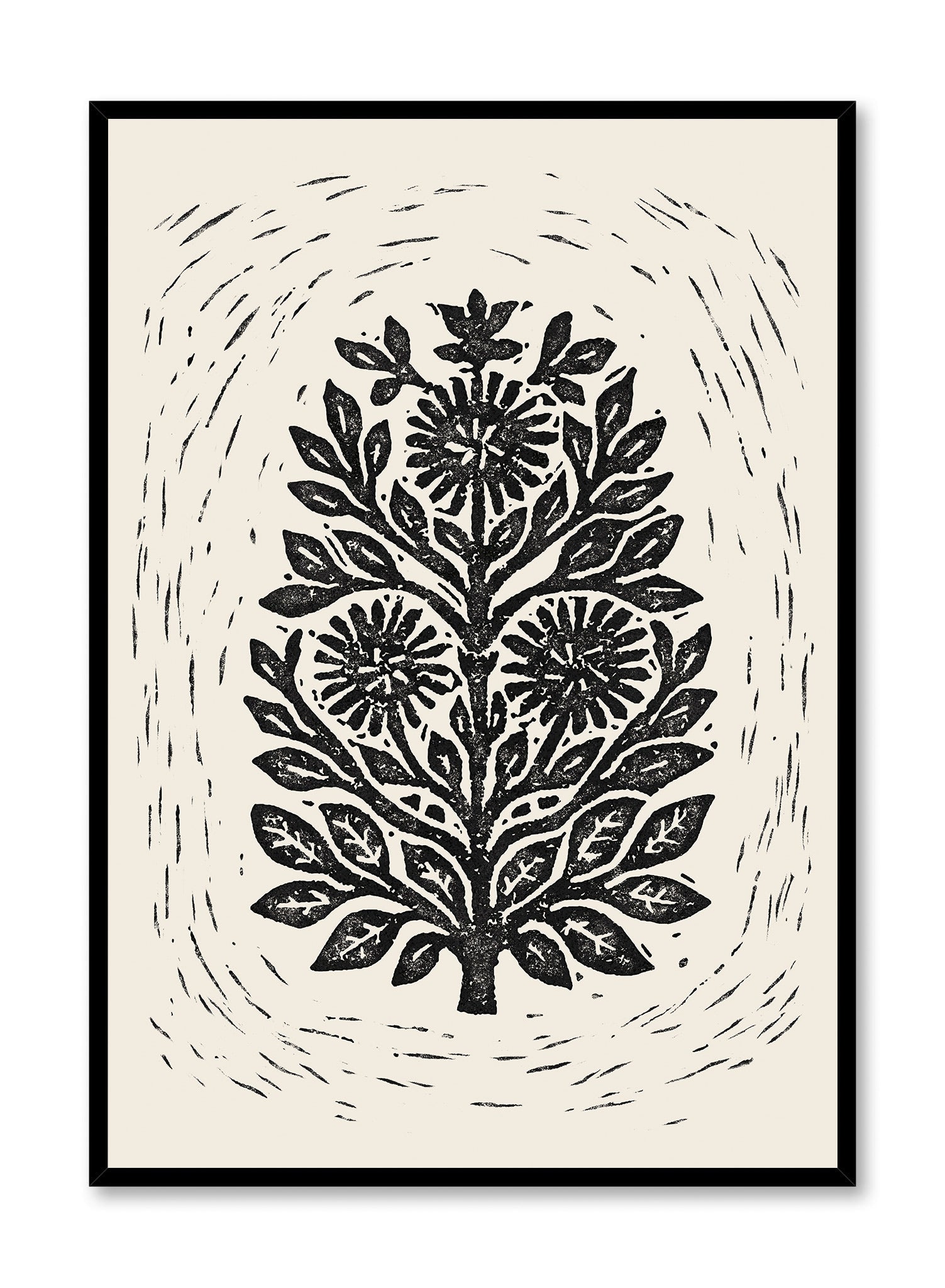 This striking print features a bold, black botanical motif set against a soft cream background. The design showcases a stylized tree with intricate leaves and circular floral elements, creating a sense of organic symmetry. The hand-drawn quality of the lines adds a touch of rustic charm, making it a captivating focal point.