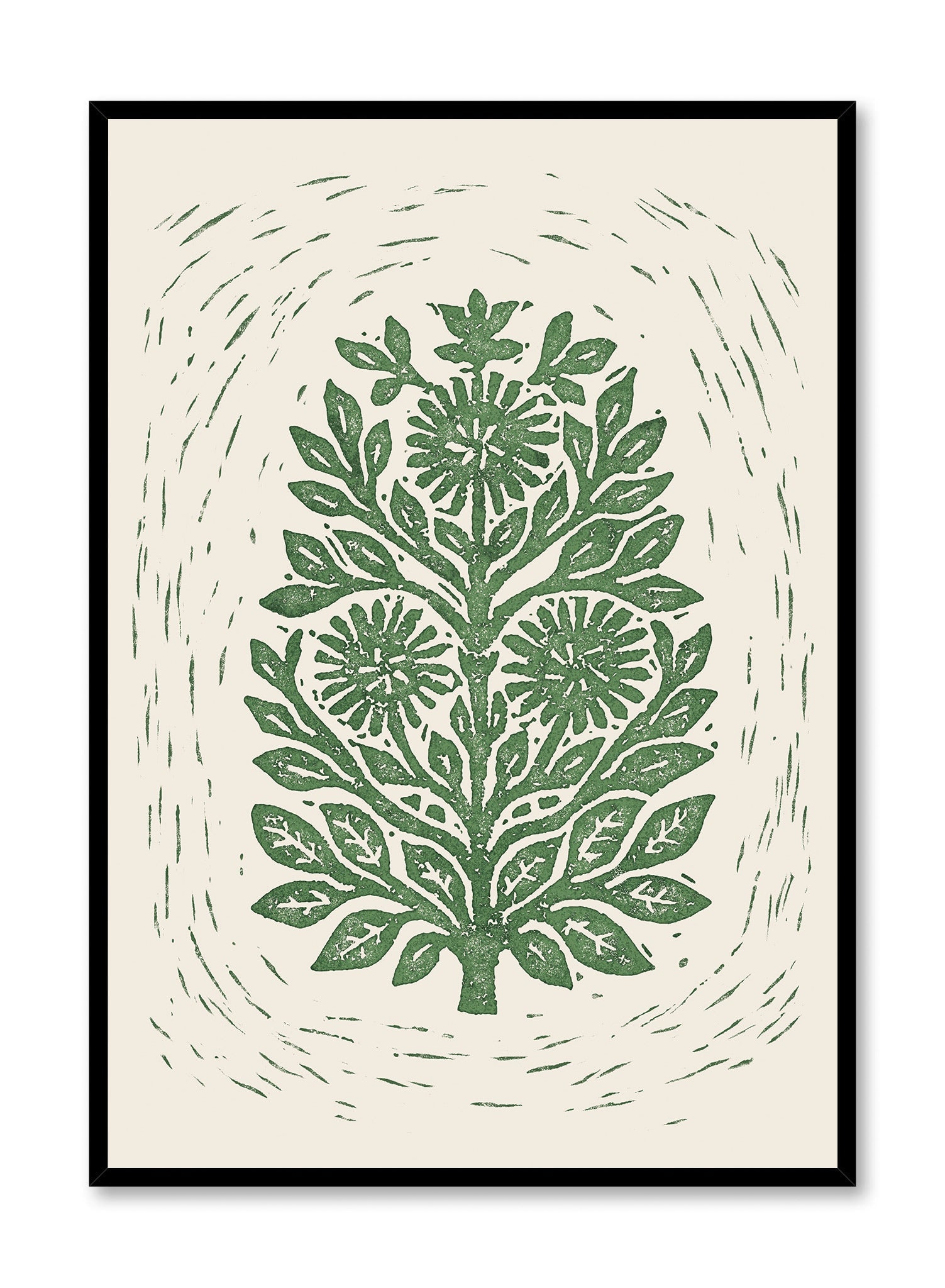 This print features a stylized botanical motif, with intricate green foliage and blooming flowers set against a soft, neutral background. The design is reminiscent of traditional block printing, with its bold lines and textured appearance, creating a sense of handcrafted artistry. The central floral arrangement is symmetrical, drawing the eye to its detailed leaves and petals, which are depicted with a charming simplicity.